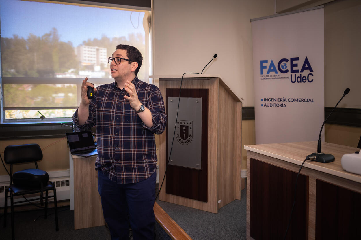 Alta participación de estudiantes y académicos tuvo la sexta presentación del ciclo 2025 de Seminarios de Investigación del Departamento de Economía, de la Facultad de Ciencias Económicas y Administrativas de la Universidad de Concepción, desarrollada el pasado jueves 16 de octubre de 2025 en el Auditorio FACEA UdeC, con la participación de Mauricio Leiva del Campo, Dr. (c) en Economía de Negocios de la Universidad del Desarrollo, académico del Departamento de Economía y Finanzas de la Facultad de Ciencias Empresariales de la Universidad del Bío-Bío.