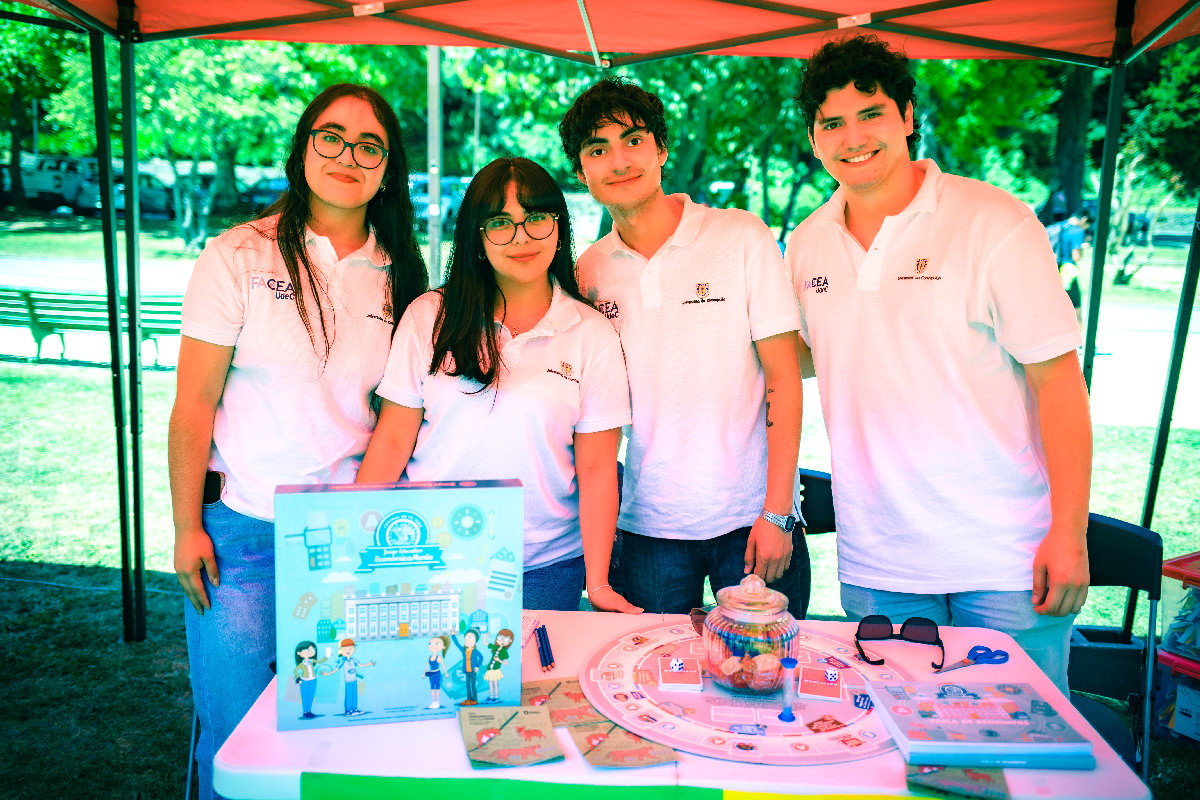 Estudiantes Valentina González, Maribel Cisterna, Nicolás Pacheco y Benjamín Barrera, en el stand de la Facultad de Ciencias Económicas y Administrativas de la Universidad de Concepción.